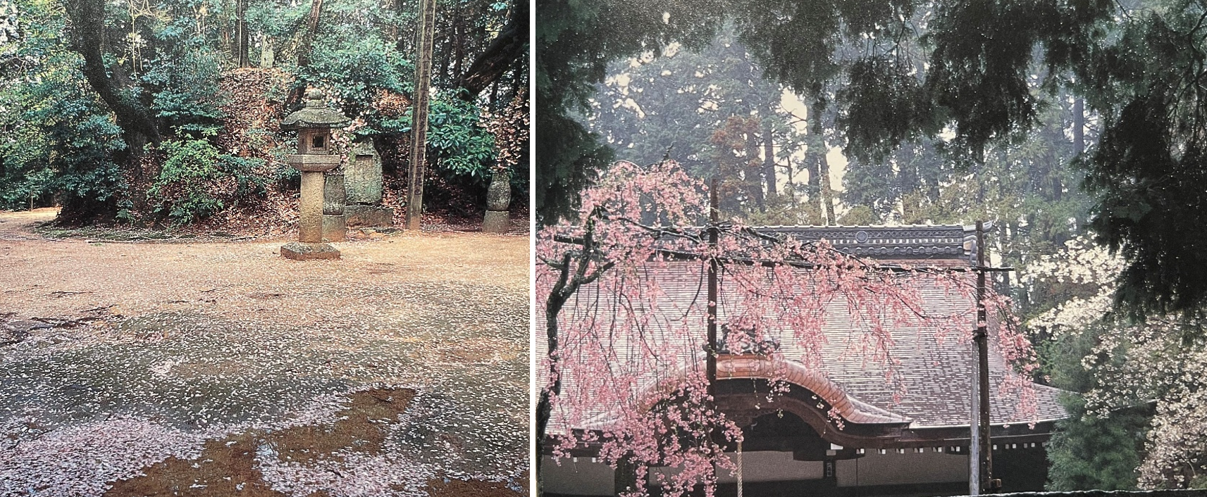 左:西行墳墓(桜の花びらが散り敷いています) 右:その墳墓がある西行終焉の地:弘川寺(ひろかわでら)大阪府南河内郡河南町弘川・真言宗醍醐派準別格本山