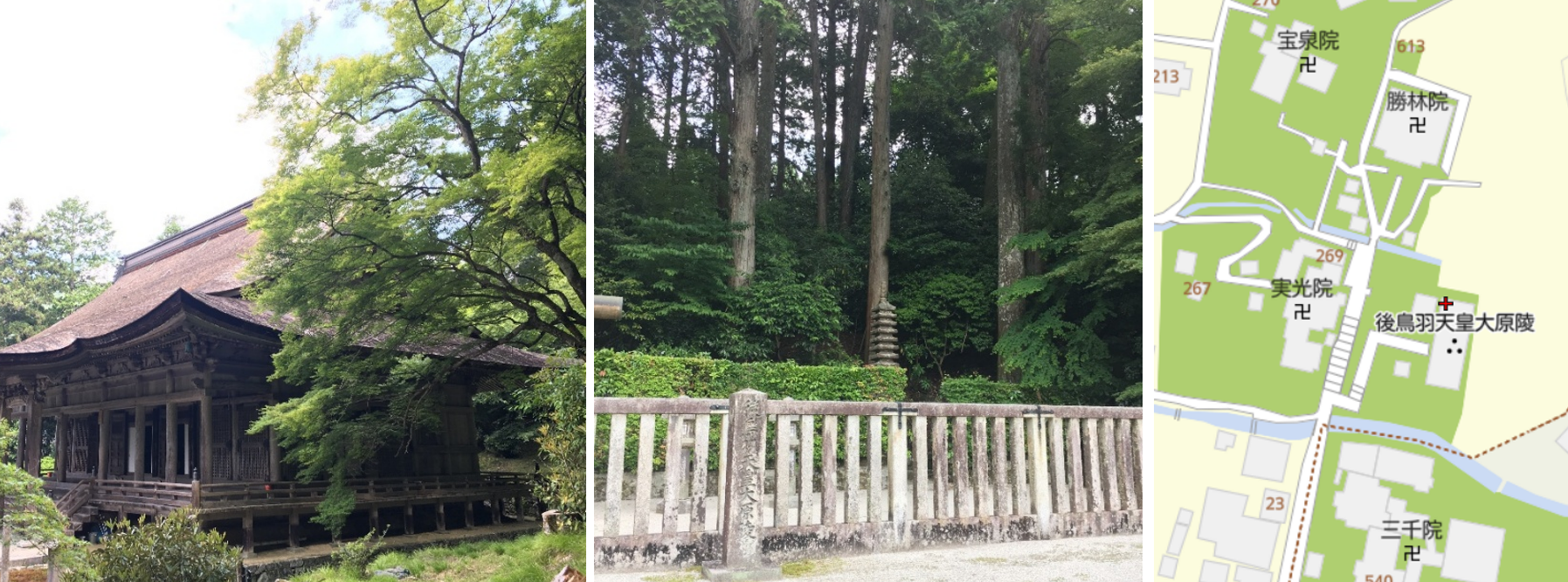 左:勝林院(魚山大原寺勝林院):長和2年(1013)に寂源によって、声明を用いた天台宗の念仏修行の道場として創建。中:後鳥羽天皇陵「大原陵」(京都市左京区大原勝林院町)右:付近地図