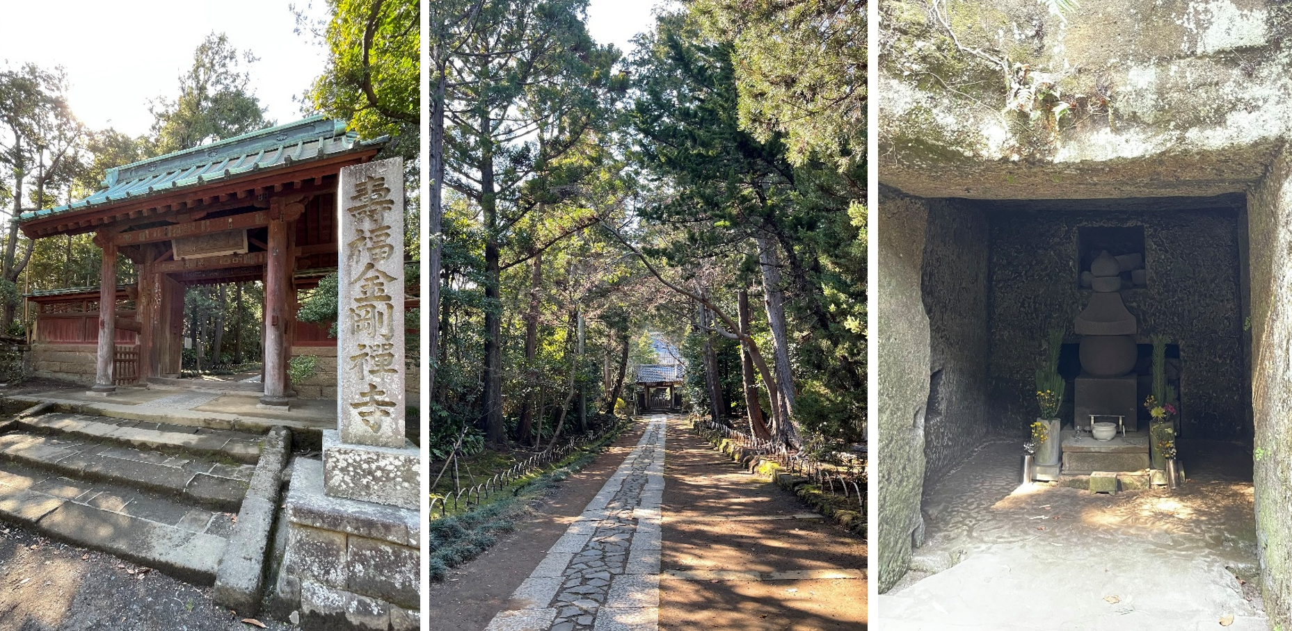 左:源実朝と実母・北条政子との墓のある寿福寺(壽福金剛禅寺)山門(鎌倉市扇ガ谷)