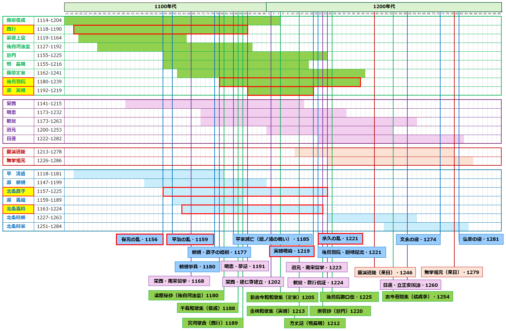 西行や定家らがいたこの平安から鎌倉時代への12世紀末から13世紀初頭にかけては、たとえば道元(1200-1253)がいた時期とも重なります。政治的には貴族政権から武家政権へと移る大きな転換期でもあり、また文化の面でも大きな変化を遂げた時期でもありました。個々の出来事にいちいち言及していったら1つの図書館ができるほどの厖大な量になってしまいますが、とりあえず簡略的な「鳥瞰年表」をあげておきます。